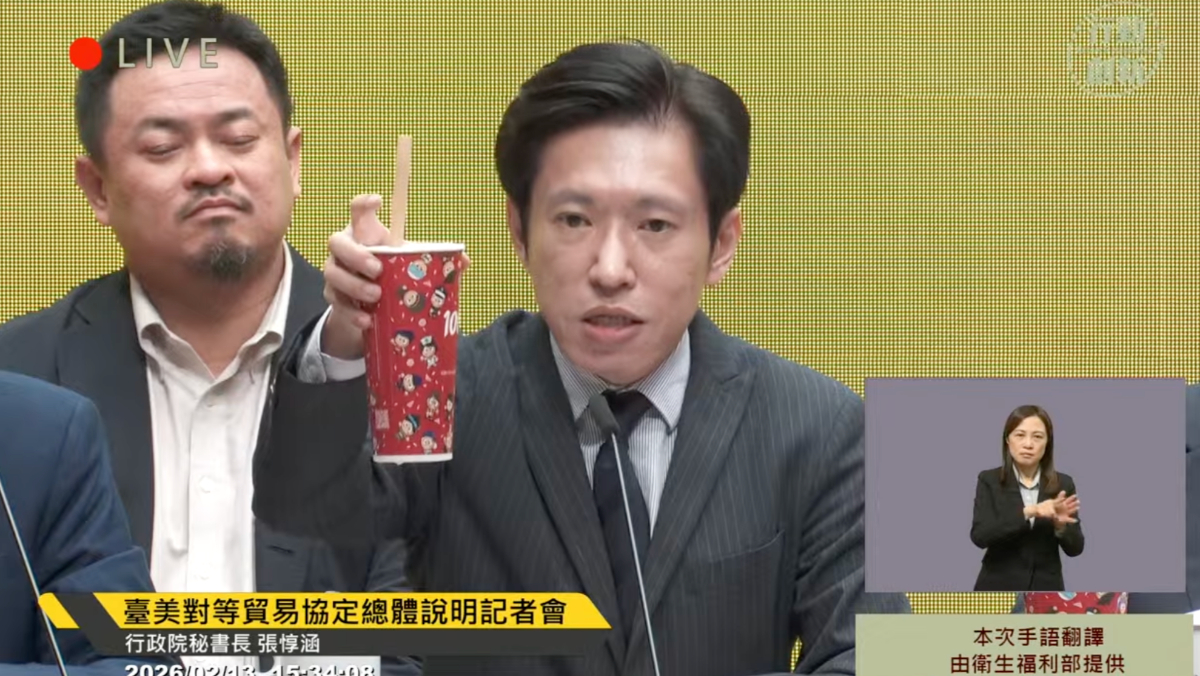 台美對等貿易協定今(2/13)完成簽署,行政院下午舉行記者會說明,秘書長張惇涵手拿珍奶指出,「這一杯是有為有守的最好印證」,這次談判結果中,茶葉豁免關稅、珍珠原料木薯粉零關稅,未來也只有台灣產的鮮奶可以標示「鮮乳」,讓酪農業者安心、消費者安心,就是政府有為有守的縮影。