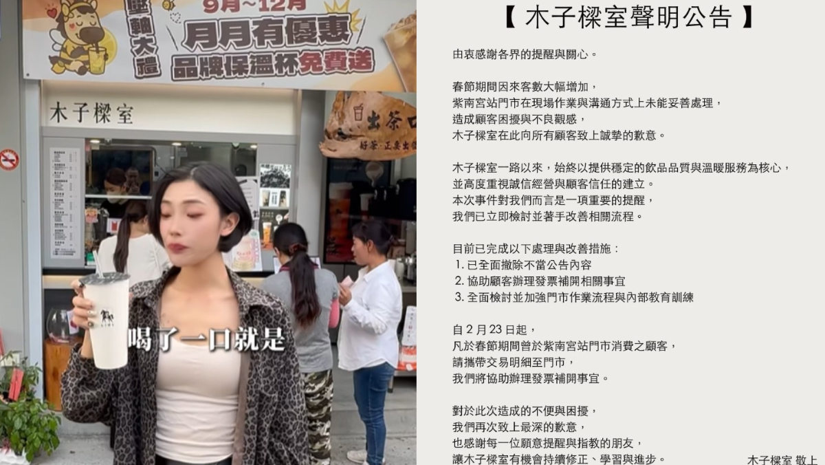 春節旅遊帶動觀光景點人潮與買氣,不過,有民眾在南投紫南宮附近的連鎖手搖飲店「木子樑室」看到「發票額度已滿,暫停開立發票」且店家沒有備案和補救措施,相當傻眼,有網友見狀更質疑店家逃漏稅。對此,木子樑室總部發道歉聲明,表示門市現場作業與溝通疏失,店家將協助消費者補開發票。