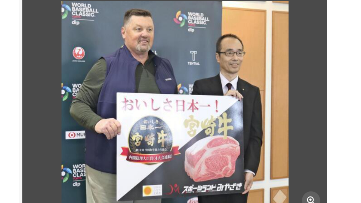 WBC(World Baseball Classic,世界棒球經典賽)官辦熱身賽在宮崎市開打,主辦城市特別致贈重達10公斤的當地特產宮崎牛,給來訪的台灣、澳洲與捷克隊代表隊,依照市價預估超過4萬台幣。