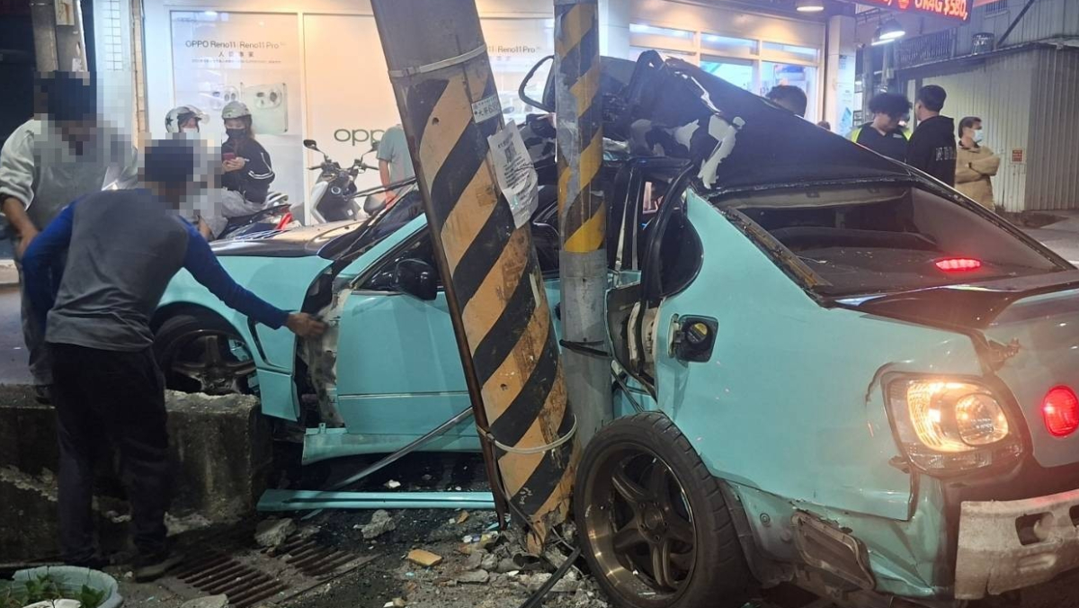 高雄市大寮區昨(3/16)晚間發生自撞事故,一輛轎車行經市道188與大明街口時,疑因車速過快失控撞上路旁電桿,強烈撞擊導致車頭嚴重凹陷,現場零件與玻璃碎片散落,並波及交通號誌及電力設施,造成周邊約4至5戶住家停電。駕駛黃男胸腔骨折、30歲曾姓乘客肋骨斷裂,送醫後均無生命危險,詳細肇事原因仍待調查釐清。