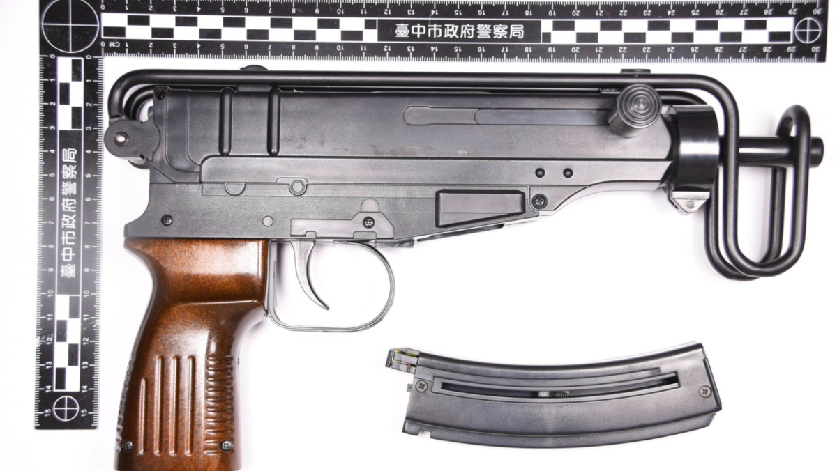 台中市一家小吃店,發生男客人用餐30元黑輪過程,背包掉出一把「衝鋒槍」,當場空氣凝結,業者和其他客人嚇到不知道該說什麼!台中市警二分局調閱百支監視鏡頭,
