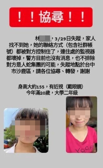 家屬在網上發文指出,林女上月29日在台中沙鹿失蹤,家人都找不到,包含電話、社群帳號疑似都被人控制,連住處的監視器都壞掉,擔心林女遭到人蛇集團控制。家屬特別公布林女特徵,身高155公分、近視戴眼鏡、年滿20歲、大學二年級生、留著齊瀏海、馬尾。