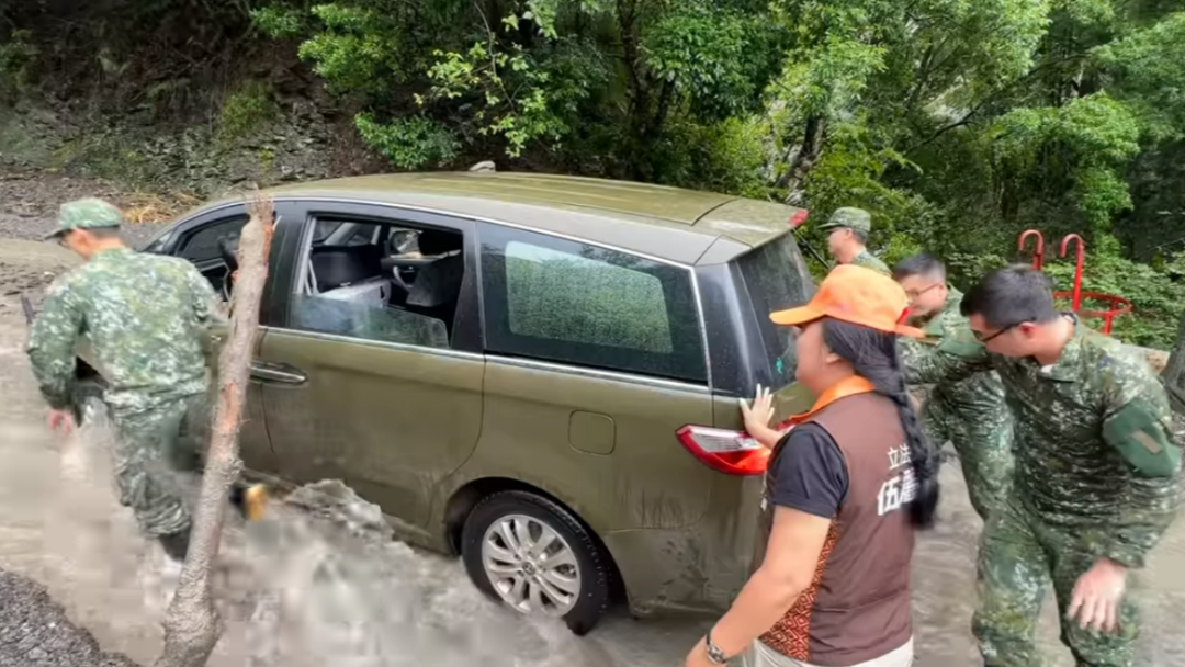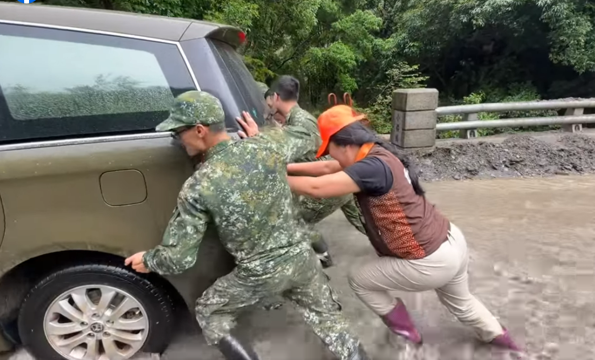 民進黨立委伍麗華勘災,遇到國軍支援軍力的車卡在爛泥裡。取自立委伍麗華臉書