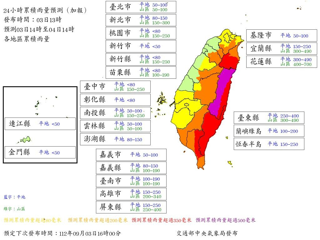 至於雨量預測方面,宜蘭山區300到490毫米,花蓮山區達400到700毫米、平地300到490毫米;台東山區達300到490毫米、平地250到400毫米;高雄山區200到340毫米;屏東山區250到400毫米。