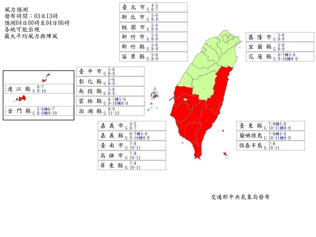 而氣象局下午1時的風力預測表示,明日清晨6時前雲林縣、嘉義縣、花蓮縣、金門縣最大陣風9至10轉8至9級;台南市、高雄市、屏東縣、恆春半島最大陣風10至11級;台東縣、蘭嶼、綠島最大陣風10至11轉8-9級;連江縣最大陣風9至10級;澎湖縣最大陣風達11至12級。