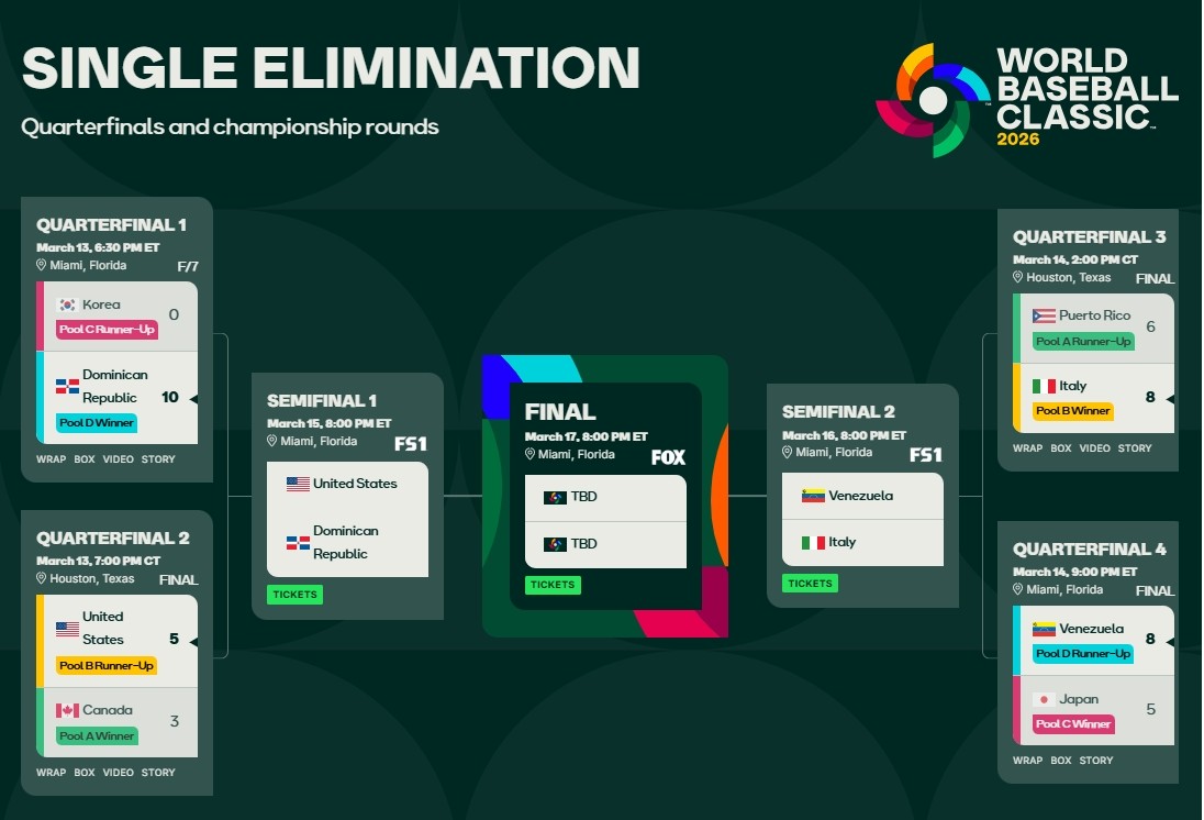 至於美國隊5-3險勝加拿大晉級,多明尼加則是以逸待勞,10-0提前在7局完勝南韓挑戰冠軍,WBC剛剛在官網更新了4強對戰組合。