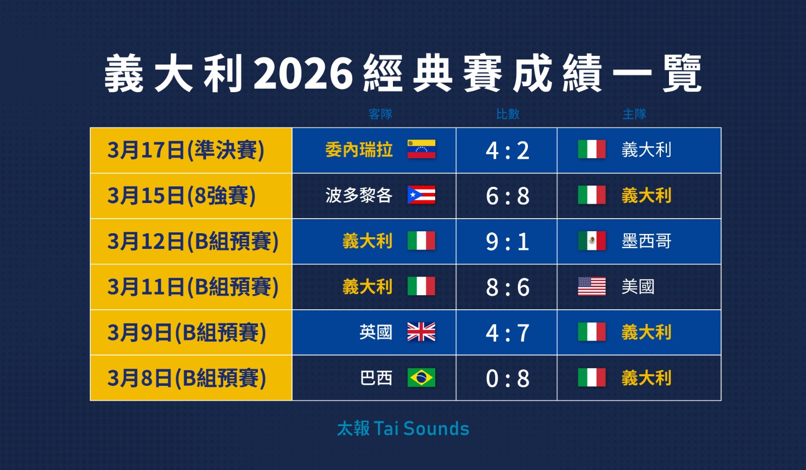 賽前在本屆經典賽仍未嘗敗績、甚至擊敗美國隊的義大利,比賽前段一度取得2:0領先,不過7局上半義大利投手先投出保送,2出局後又接連被敲出安打,最終一口氣失掉3分,也讓比賽就此定調。