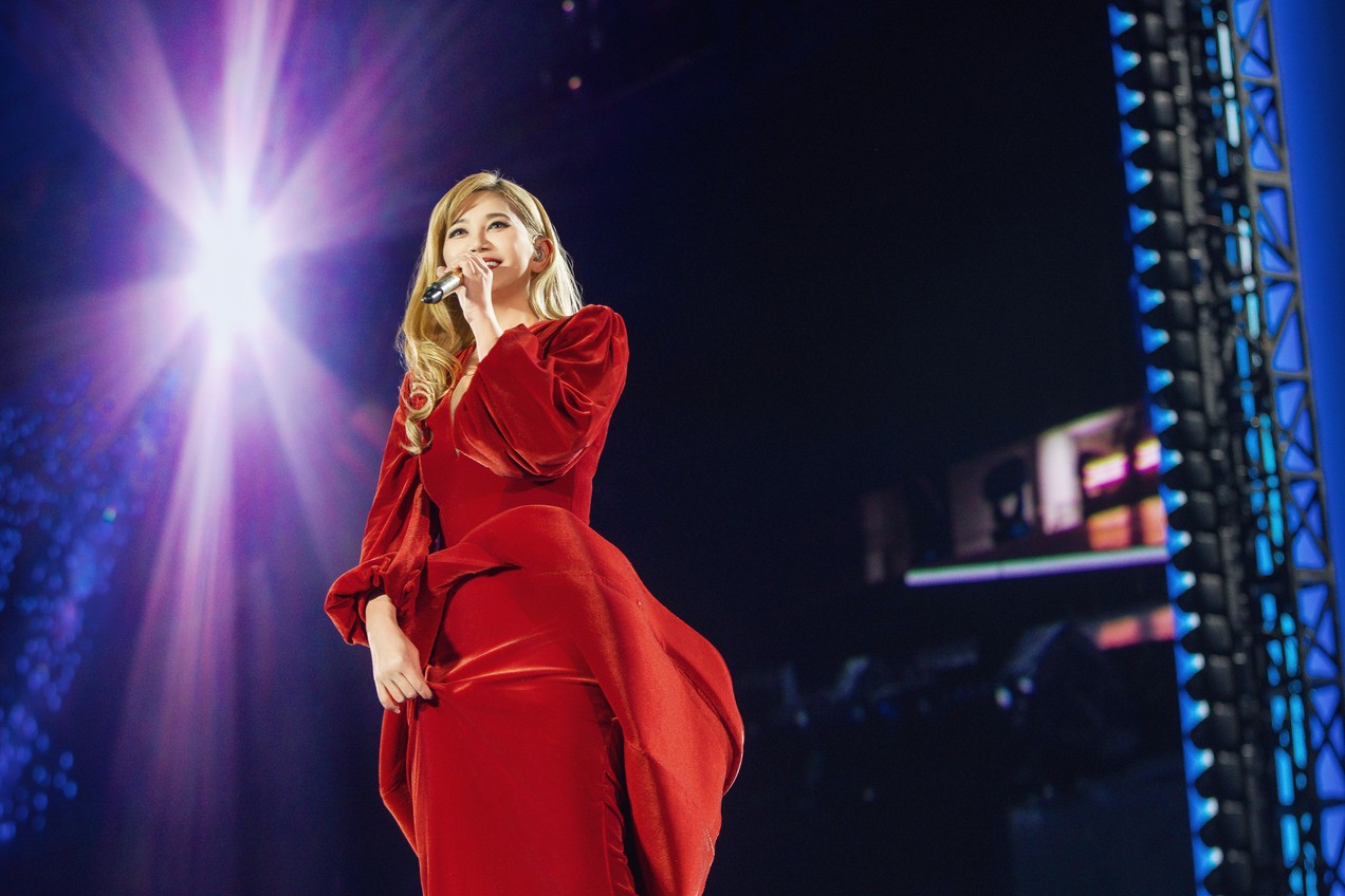 梁靜茹以紅色天鵝絨斗篷晚禮服開場。超級圓頂提供