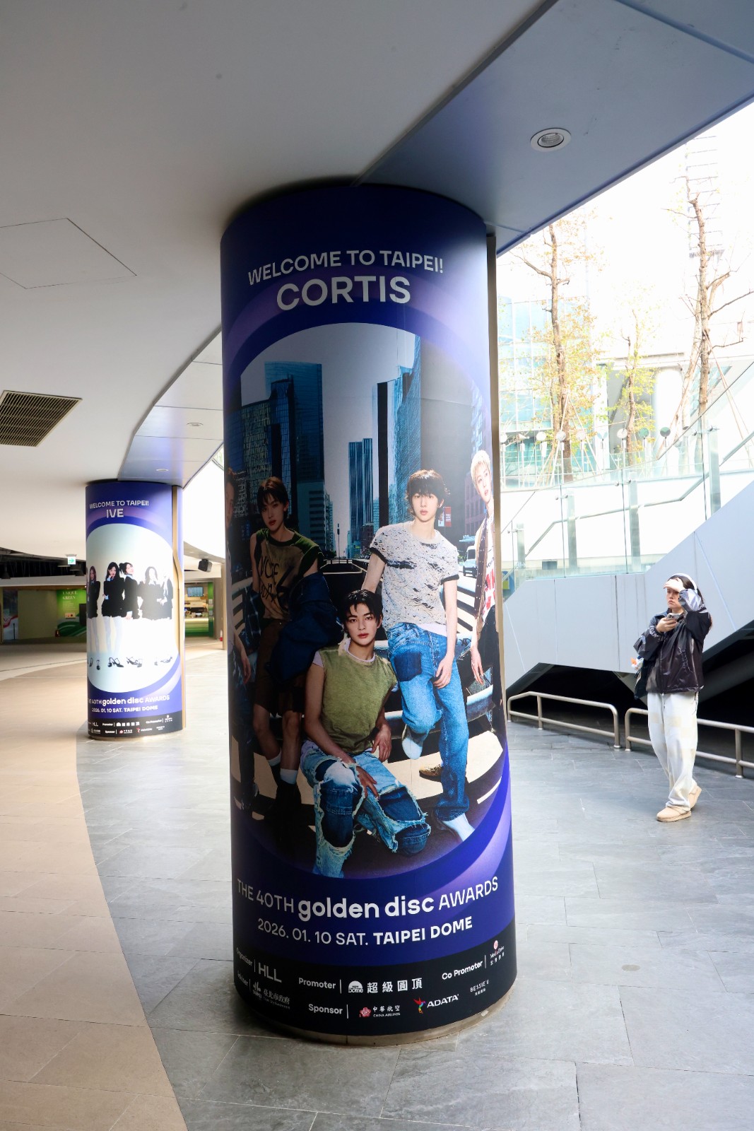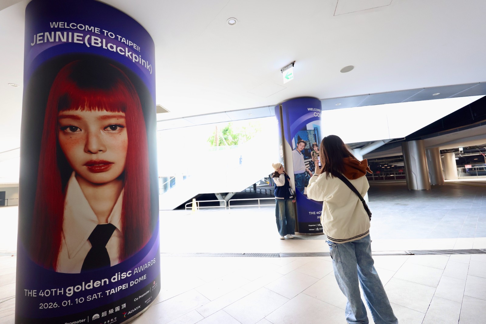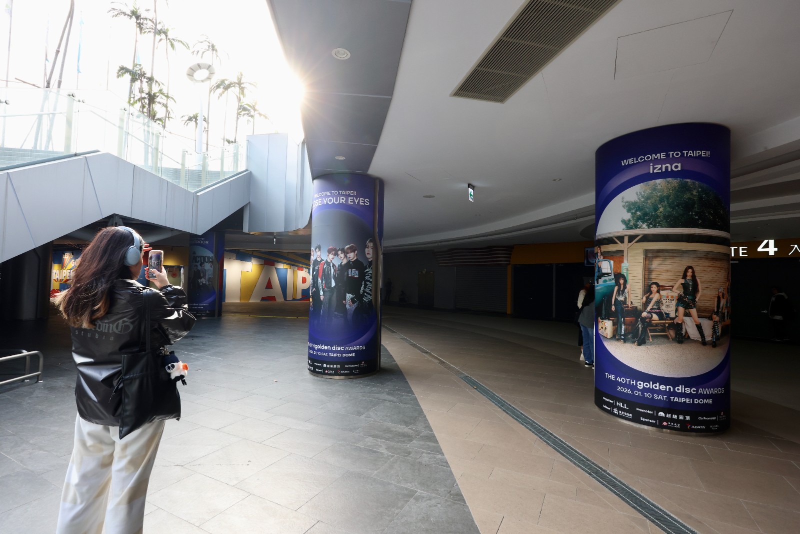 第40屆金唱片獎本週末(1/10)將在台北大巨蛋登場,主辦單位昨(1/7)日完成大巨蛋外圍柱面布置,包含Jennie、蔡依林、許光漢、邊佑錫、CORTIS等人柱面一字排開,吸引不少粉絲在上下班時段直奔現場拍照留念,典禮倒數儀式感瞬間拉滿。