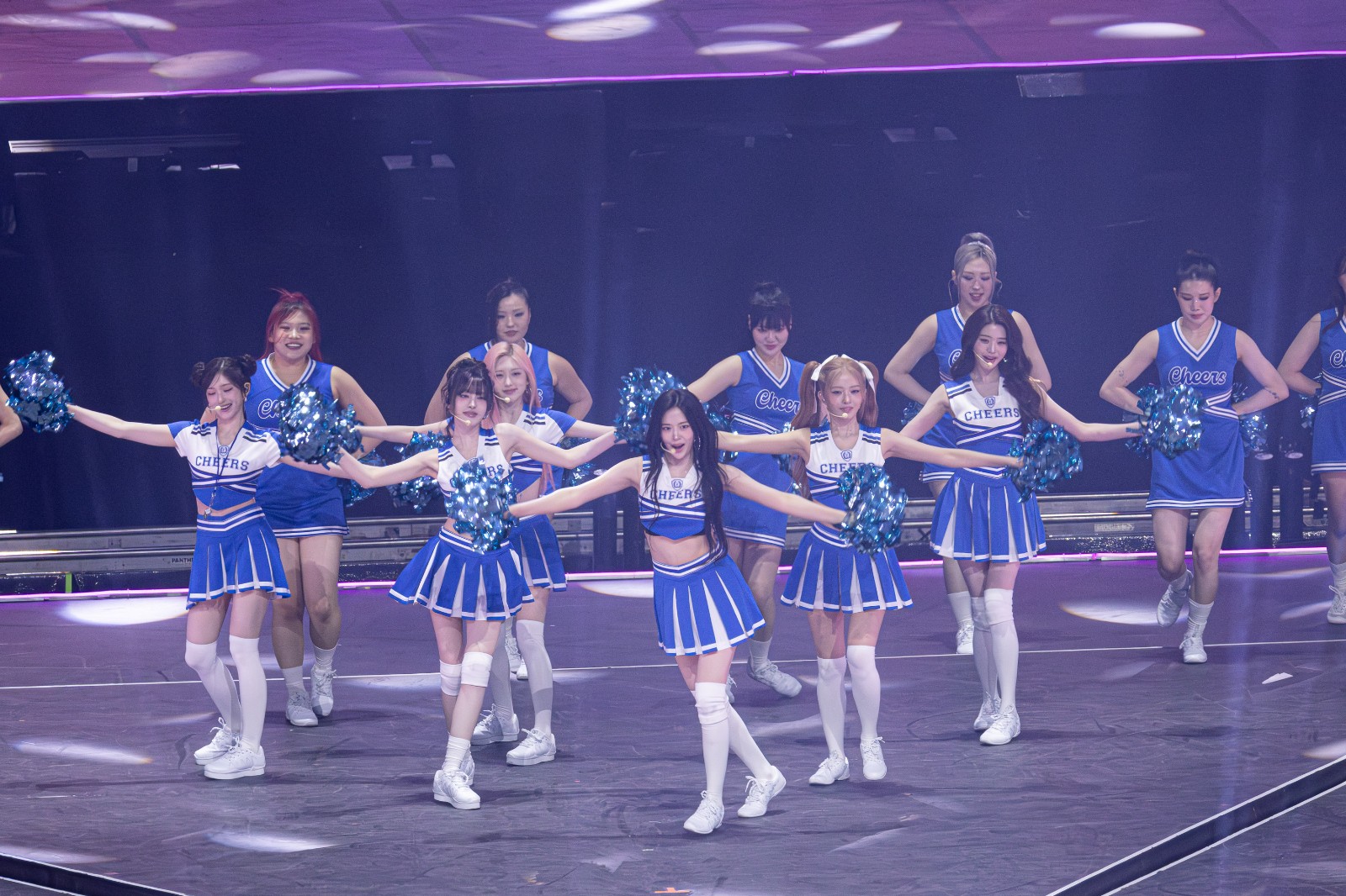 IVE穿著啦啦隊服、手拿藍彩球熱力唱跳,為了這次表演,她們帶了22位舞者,其中10位還是專業的啦啦隊員,整齊劃一的舞蹈與精采的拋飛動作,讓全場感受青春無敵。