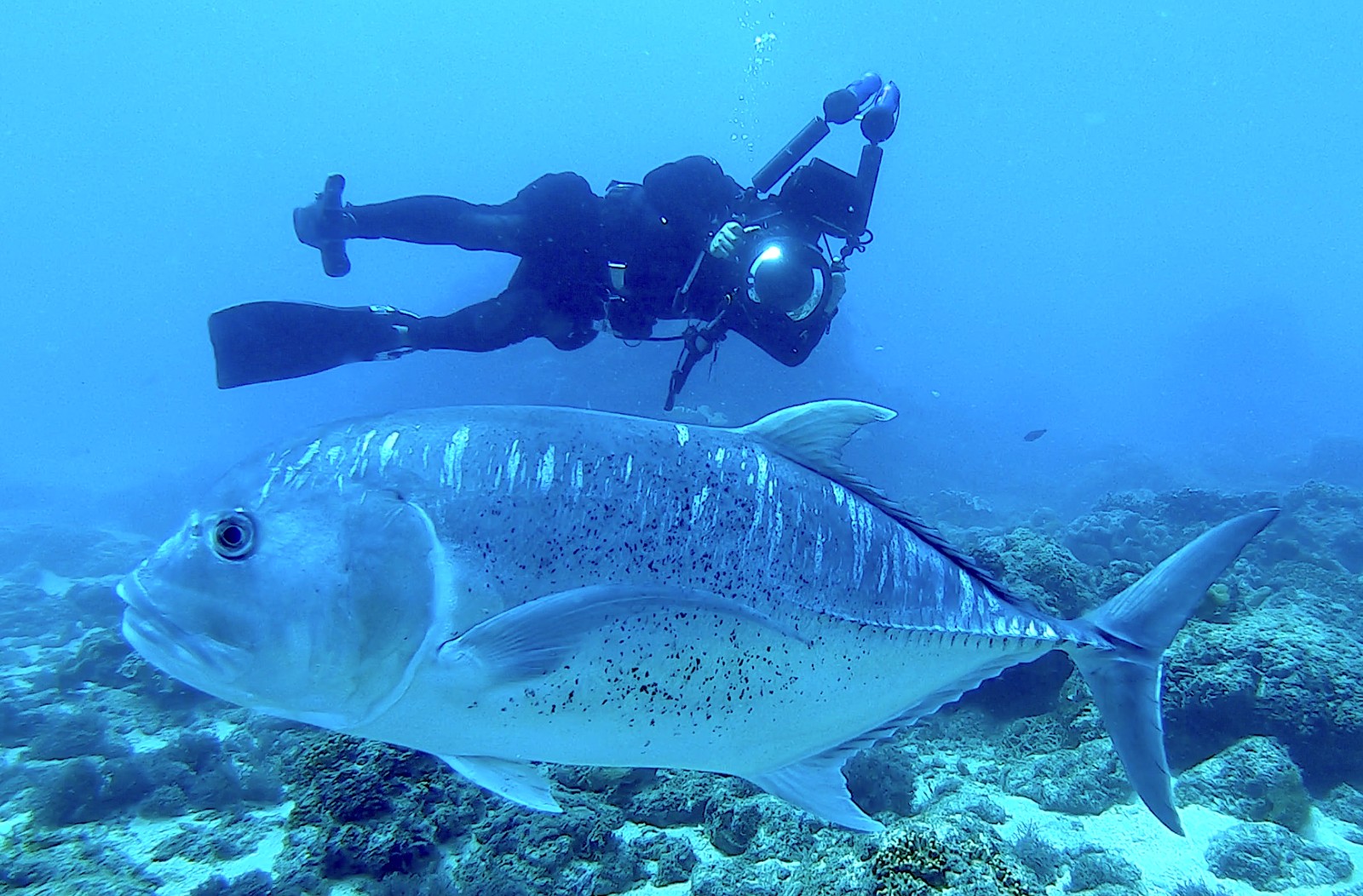 周文欽未拍到夏曼‧藍波安的朋友蘭嶼浪人鰺,他為此到墾丁國家公園水域見見當地的大明星「大牛」浪人鰺,見識牠們的魅力。目宿媒體提供