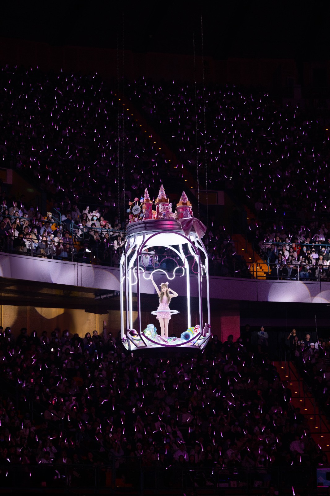 王心凌終於搭上「SUGAR HIGH限定版夢幻飛天糖罐子」繞行全場。寬宏藝術 X 天晴娛樂提供