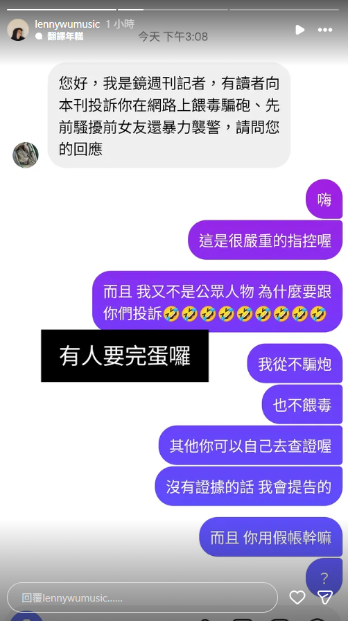 伍諒接著PO出記者和他查證的對話內容,強調自己沒騙砲、也沒餵毒,並揚言提告。翻攝自IG@lennywumusic
