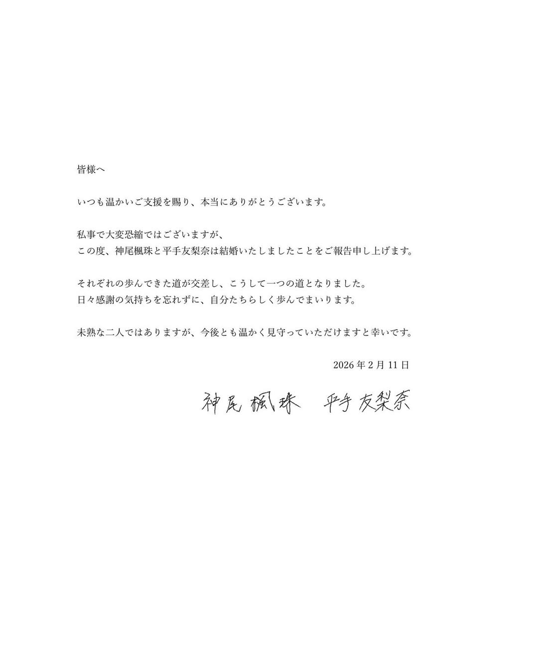 神尾楓珠、平手友梨奈公開一張合照並附上親筆簽名,「承蒙各位一直以來溫暖的支持與關照,謹致上由衷的感謝。因屬私事,冒昧打擾,特此向各位報告:神尾楓珠與平手友梨奈已正式結為夫妻。」聲明中以「彼此走過的道路在此交會,並就此成為同一條人生之路」形容雙方的結合,強調未來將不忘每日的感恩之心,以屬於自己的方式一步步前行,也懇請外界持續溫暖守護。