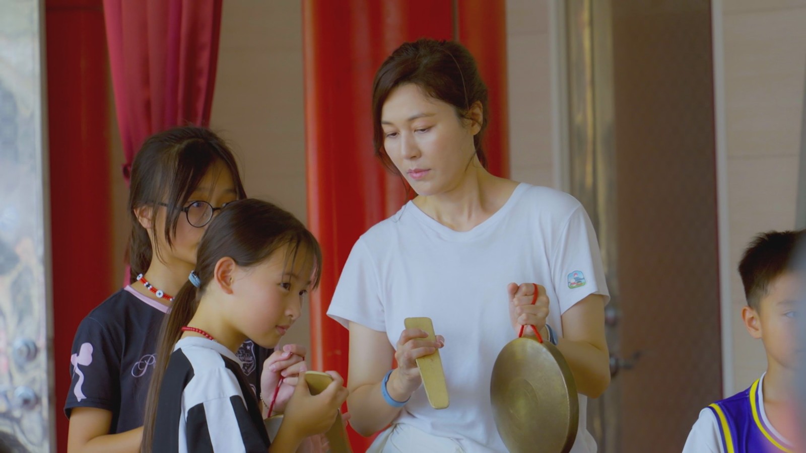 金荷娜敲鑼,體驗客家八音的傳統樂器。客台提供