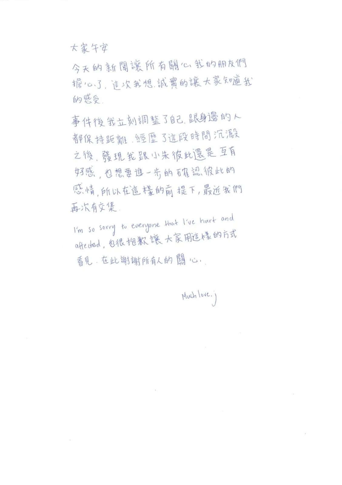 感情風波再次受矚目,吳卓源說:「I'm so sorry to everyone that I've hurt and affected(對於所有被我傷害和影響到的人,我深感抱歉),也很很抱歉讓大家用這樣的方式看見,在此謝謝所有人的關心。」