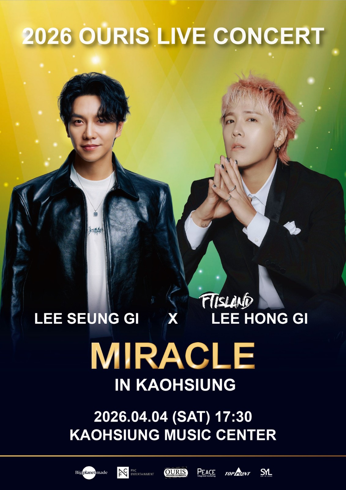 夢幻韓流組合即將登台!唱功一流的李昇基與好友FTISLAND主唱李洪基即將強強聯手,確定4月4日兒童節當天在高雄流行音樂中心舉辦《2026 OURS LIVE CONCERT [MIRACLE] IN KAOHSIUNG》,演出門票將於2月6日在年代售票開賣,而這場演出不僅是2人首次在海外舉行聯合演唱會,更是一場友情結合實力、音樂熱情的奇幻表演。