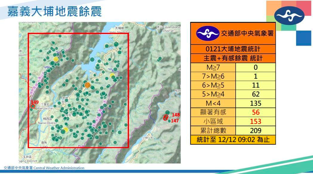 昨天(12/11)晚間高雄市甲仙區連3起有感淺層地震,其中兩起規模4.7,今(12/12)晨4時24分台南市楠西區又發生規模4.0地震。中央氣象署地震測報中心科長邱俊達今上午表示,楠西的地震歸類在1月21日大埔地震的餘震序列裡面。
