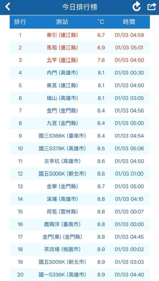 今日清晨台灣低溫排行。取自鄭明典臉書