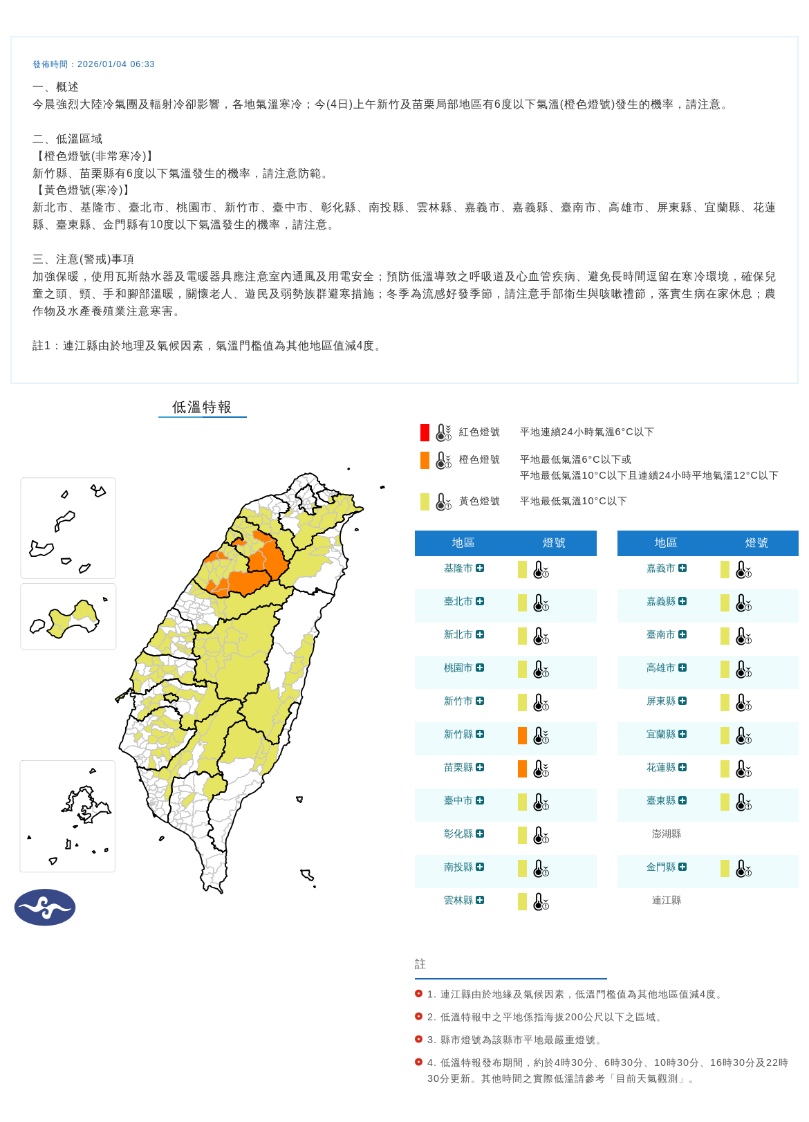 今日(1/4)清晨受強烈大陸冷氣團及輻射冷卻影響,清晨新竹縣關西只剩4.8度,苗栗縣頭屋、造橋、後龍等地也不到6度,氣象署針對全台20縣市發布低溫特報。白天冷空氣減弱,氣溫回升且環境偏乾,不過短暫回暖一天後,明日(1/5)起又有一波強烈大陸冷氣團南下,強度恐達到寒流等級。
