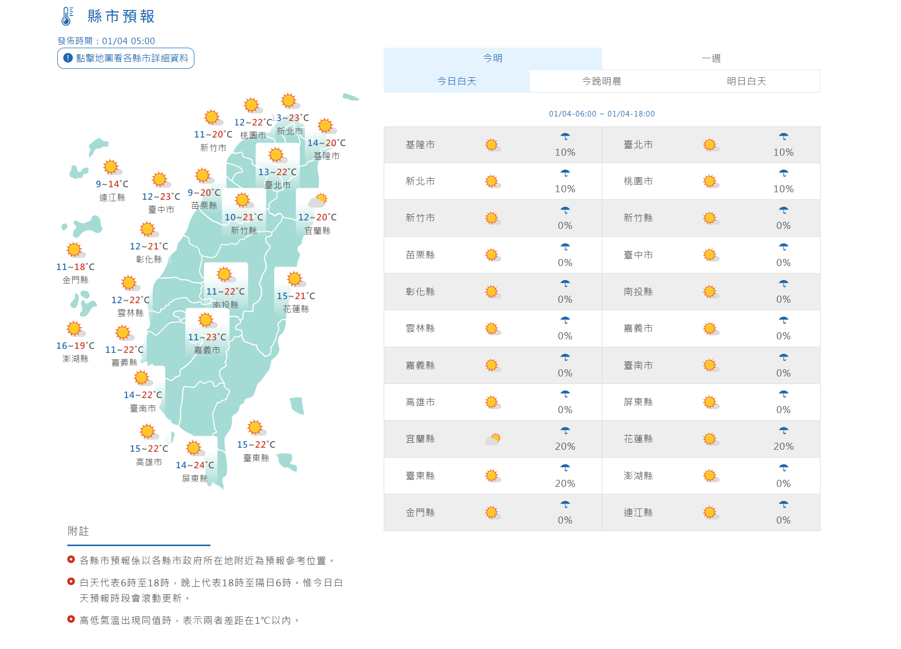 氣象署指出,今日冷空氣威力持續減弱,白天中部以北、東北部約10度,南部、花東地區約14度,不過清晨受到輻射冷卻影響,竹、苗一帶可能出現6度以下極低溫,氣象署也針對全台20縣市發布低溫特報。白天氣溫回升,西半部及東北部日夜溫差大,台灣各地及澎湖、馬祖、金門多為多雲到晴,僅基隆北海岸、東半部地區及恆春半島有零星短暫雨。明日另一波強烈大陸冷氣團南下,新竹、苗栗、東南部地區及恆春半島、馬祖有零星短暫雨,其他地區及澎湖、金門為多雲到晴。