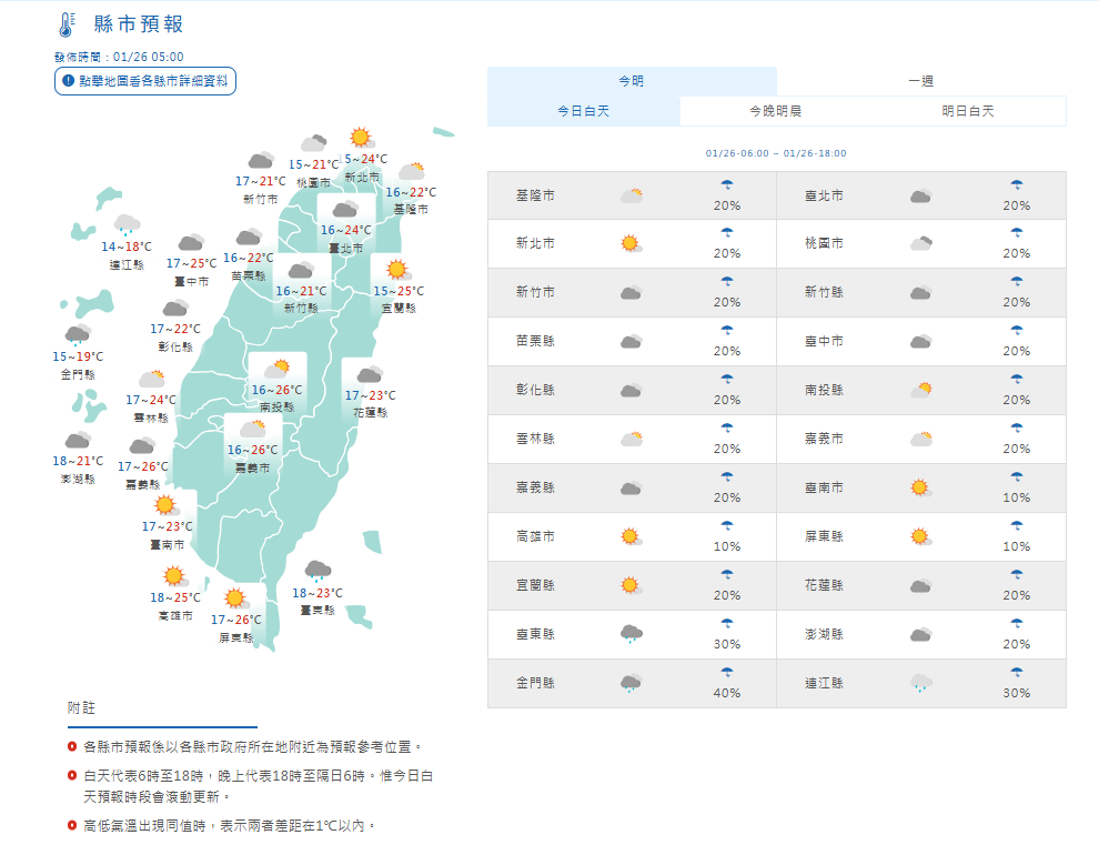 中央大學大氣科學系兼任副教授吳德榮在「洩天機教室」專欄撰文指出,明日上午起東北季風逐漸南下,氣溫緩步下降,北部、東北部雲量增加、降雨機率提高;週三北部雨後多雲、中南部晴時多雲,東半部偶有局部短暫雨,北台灣轉為偏涼微冷。週四至週六(1/31)各地晴時多雲,東半部偶有局部短暫雨,氣溫逐日回升。