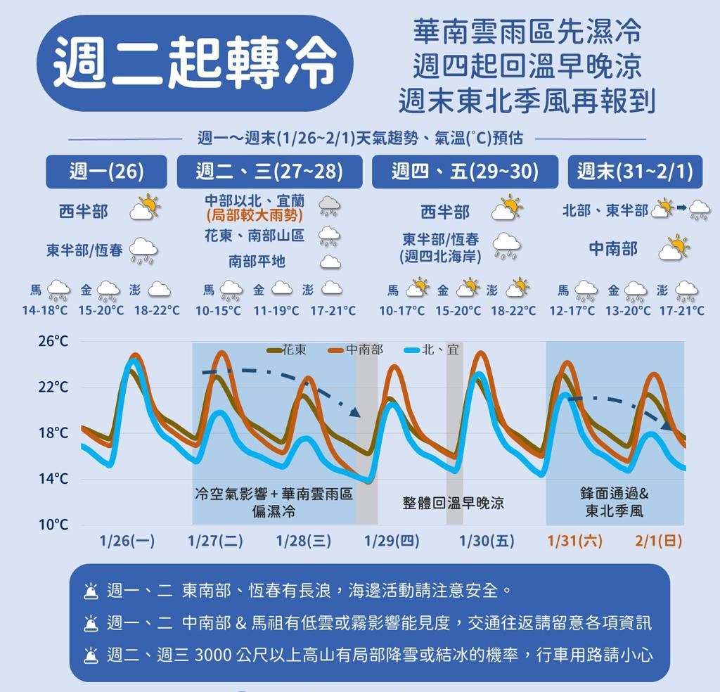 今日(1/26)各地天氣多為多雲到晴的好天氣,不過明日(1/27)起東北季風增強或大陸冷氣團南下,北部氣溫將下降,28至29日一連兩天明顯降溫、雨勢增加,最低溫恐下探11度。1月31日再有一波冷空氣南下,北部天氣再度轉涼、有雨,提醒民眾注意天氣變化,並適時增添衣物,注意保暖。