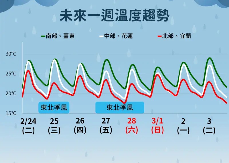 週日(3/1)至下週一(3/2)上午天氣略為好轉、天氣回暖,不過局部地區仍有短暫降雨機率。下週一下午起至下週五(3/6)又是另一段短波盛行,繼續晴雨、冷暖頻繁更迭的天氣型態。