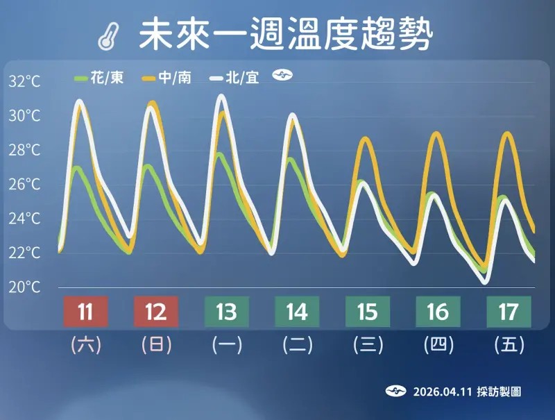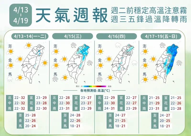 週三、週四(4/16)將有微弱鋒面在北部海面附近活動,各地大致為多雲到晴,北台灣高溫略降,不過整體仍偏暖,北部地區偶爾受到鋒面邊緣影響,可能出現局部短暫雨。週五(4/17)、週六(4/18)另道結構較鬆散的鋒面掠過台灣北方,北部及東半部地區轉為偶有局部短暫雨,其餘地區仍維持多雲到晴的天氣,不過北部與東半部會略為降溫,感受較舒適,中南部則依舊偏熱。