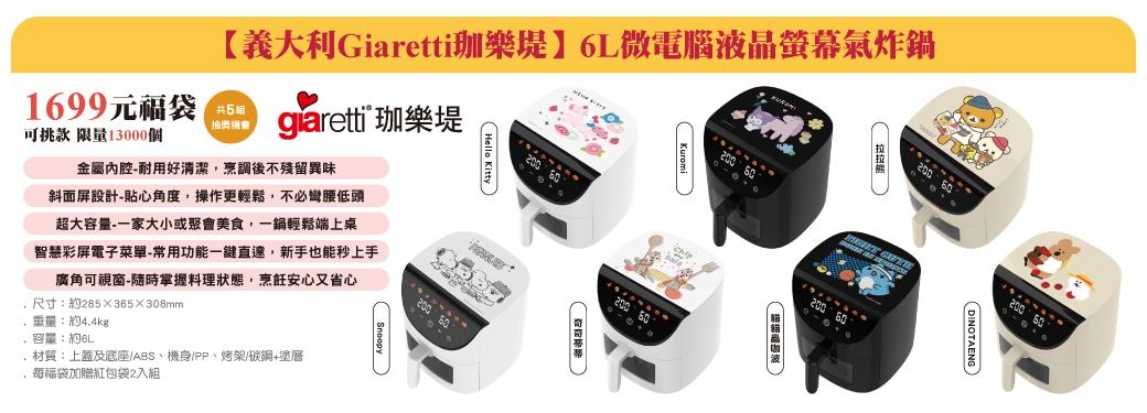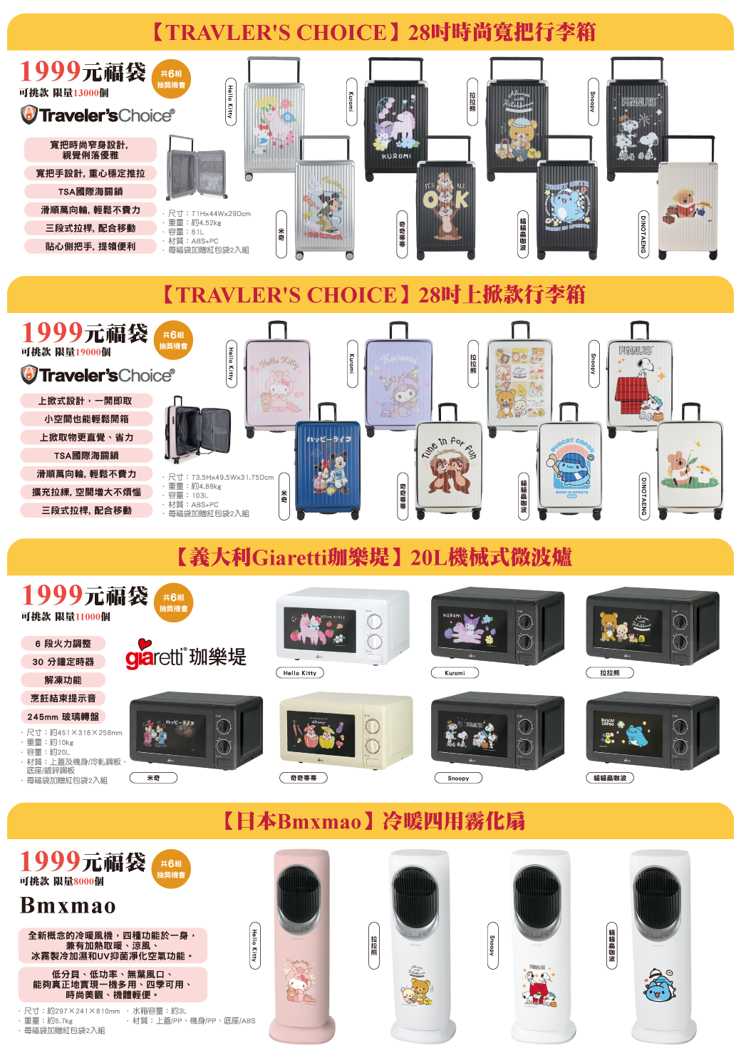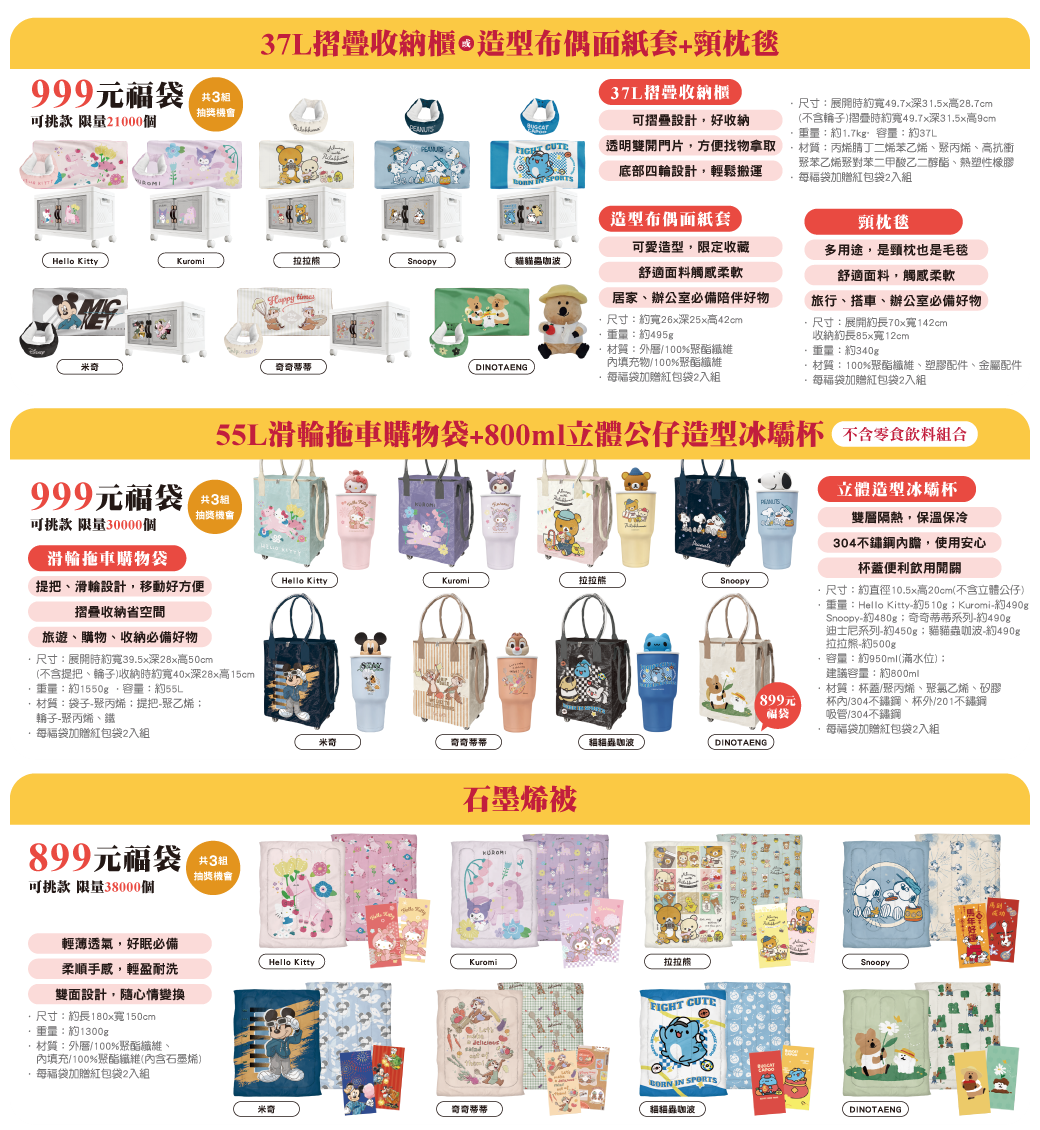 8大IP聯名,包括KITTY、KUROMI、SNOOPY、奇奇蒂蒂、迪士尼、拉拉熊、貓貓蟲咖、DINOTAENG,價格從499元到1999元,品項從托特包、泡麵碗、收納櫃到氣炸鍋、微波爐、行李箱都有,款款可愛爆擊,讓粉絲陷入選擇困難!
