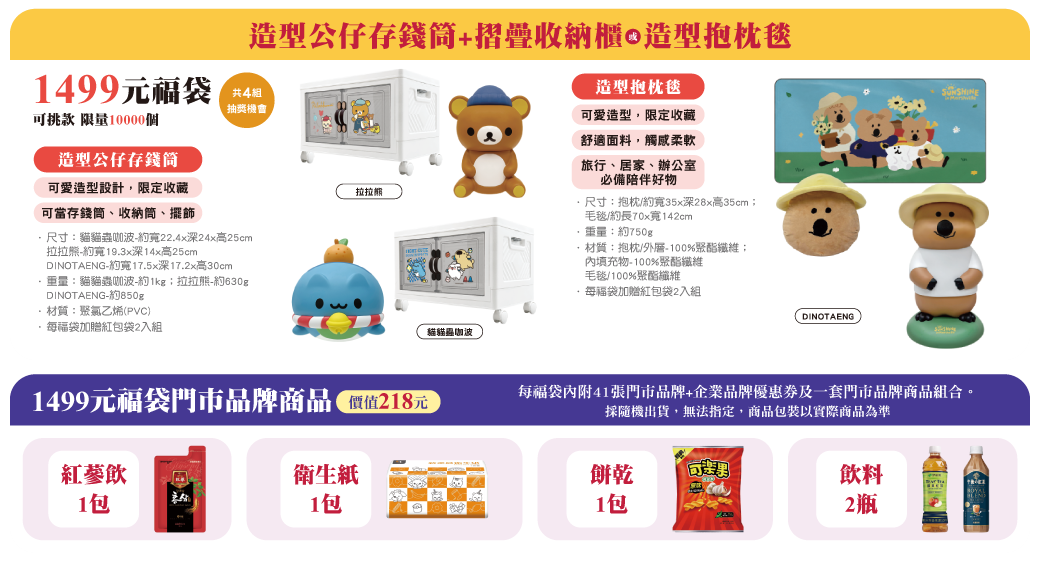 「品牌福袋」共有13款,售價199元到999元,包括春節日系品牌福袋、日系文具3C筆電收納包、可可樂造型保冷袋等,充滿翻玩趣味。