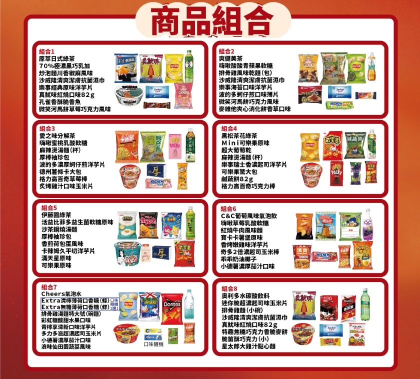 「馬年福袋商品組合」,共有8款,售價200元,內含抽獎券1張,品項包括樂事洋芋片、日清三明治餅乾、濕巾、益生菌軟糖、運動補給飲料等。