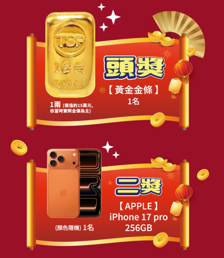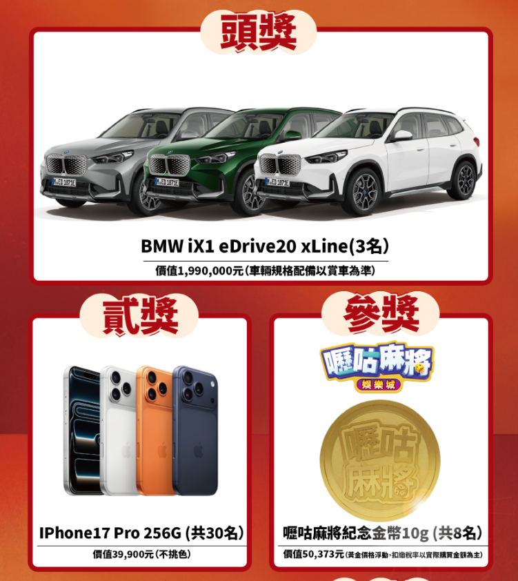 每款皆含抽獎券,頭獎為價值199萬元的BMW iX1 edrive20 xLine(3名),貳獎是價值3萬9900元的IPhone 17 Pro 256G(30名),參獎為價值5萬373元的嚦咕麻將紀念金幣10g(8名)。