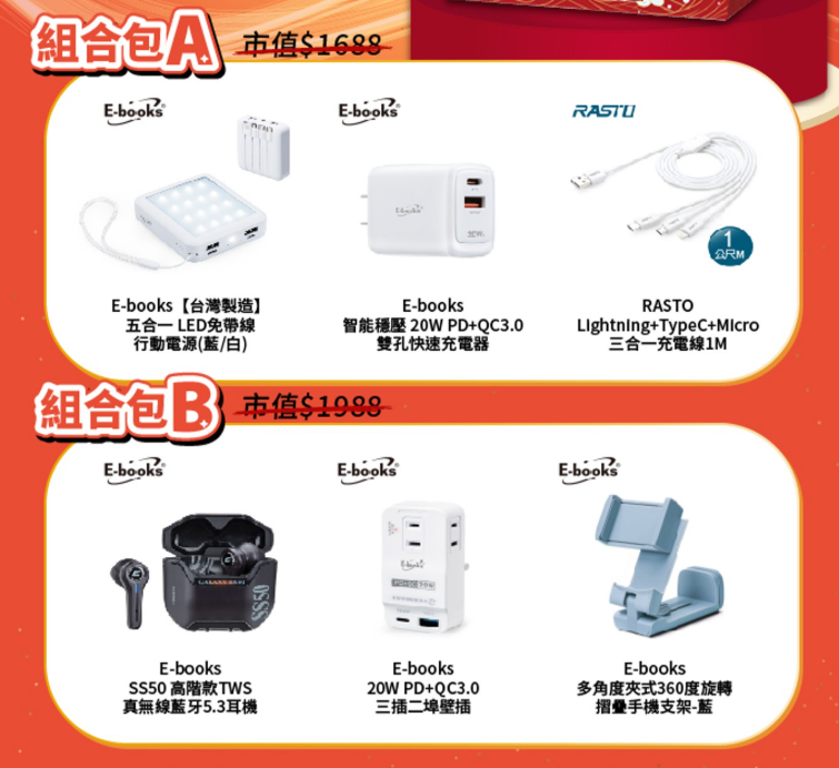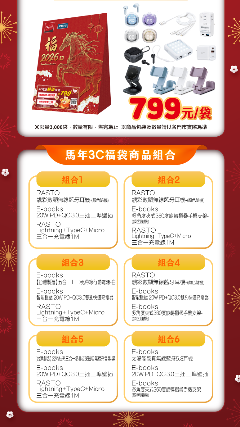 「馬年3C福袋」,共有6款,售價799元,內含抽獎券2張,品項則有無線藍牙耳機、三合一充電線、快速充電器、壁插、手機支架等。