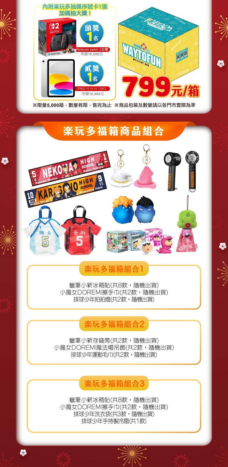「樂玩多福箱」,共3款,售價799元,內含抽獎券2張,品項包括冰箱貼、拍拍燈、運動毛巾、手持製冷扇等,另可抽市偠1萬5580元的switch 2、市價1萬900元的IPAD 11。