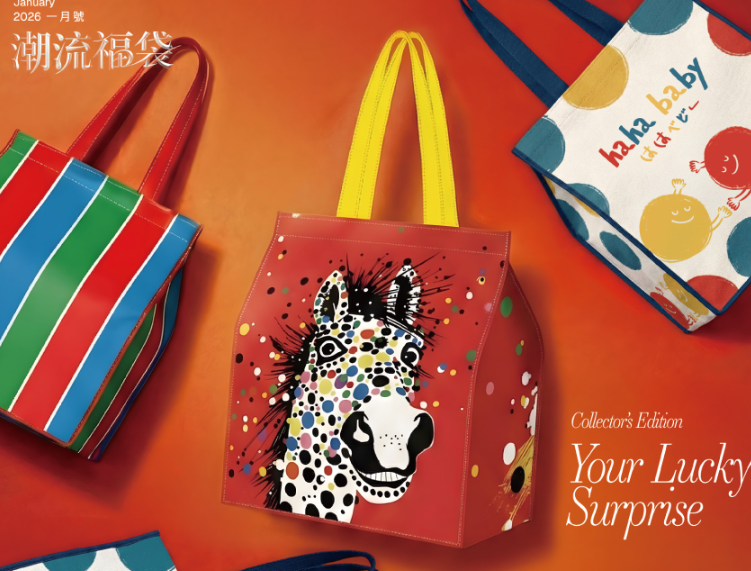 「潮流福袋」共有3款,售價249元,內含零食飲品,共8種組合;提袋有新春馬年、hahababy聯名、懷舊茄芷袋等。