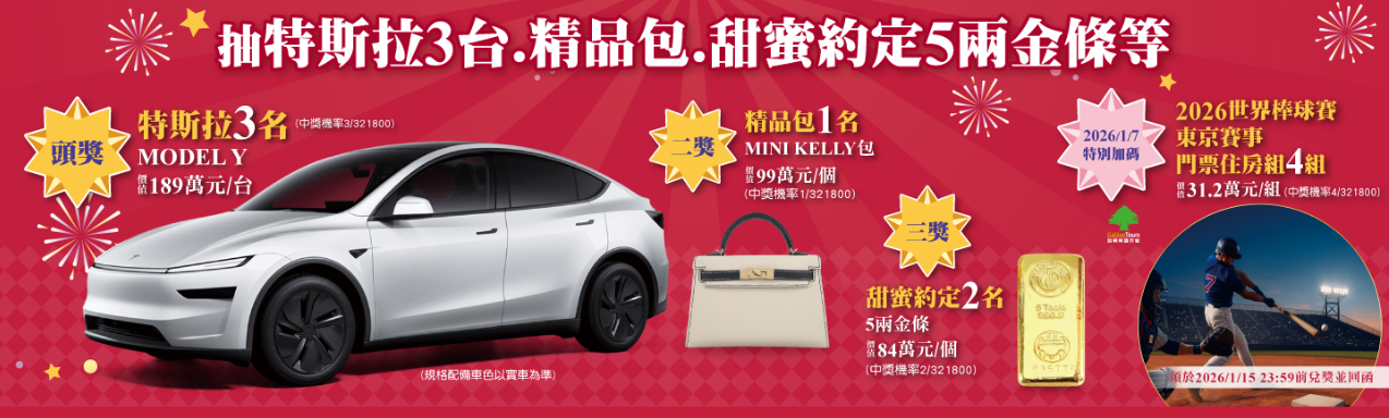 每款均含一張大獎抽獎券,頭獎為價值189萬的特斯拉MODELY(3名),二獎是價值99萬的MINI KELLY名牌包(1名),三獎為價值84萬元的5兩金條(2名),另有特別獎2026世界棒球賽東京賽事門票住房組,每組為2人同行、價值31.2萬元,共4組。