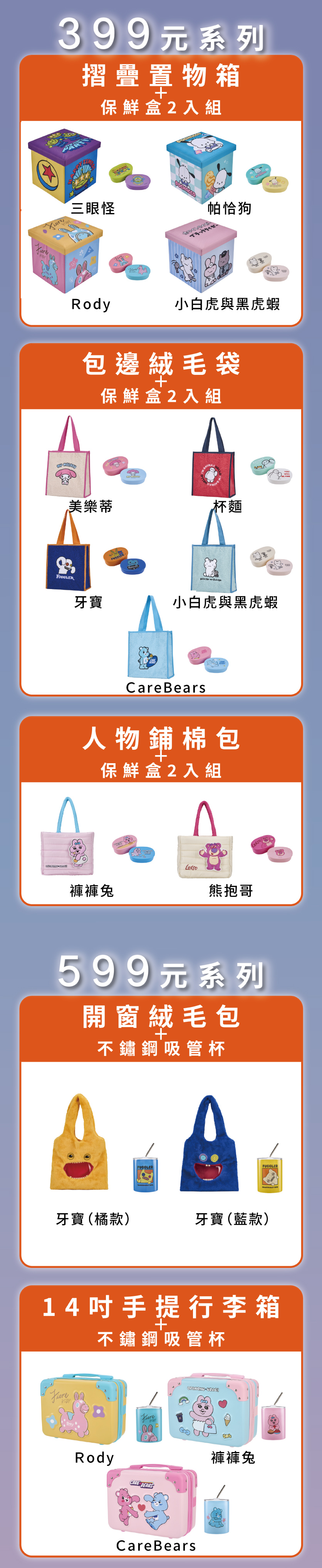 「肖像福袋」共有25款,售價399元到1599元,聯名品牌包括布丁狗、CareBears、毛怪、褲褲兔、雙星仙子、牙寶等,品項則有置物箱、保鮮盒、不鏽鋼吸管杯、手提行李箱等,實用性極高。