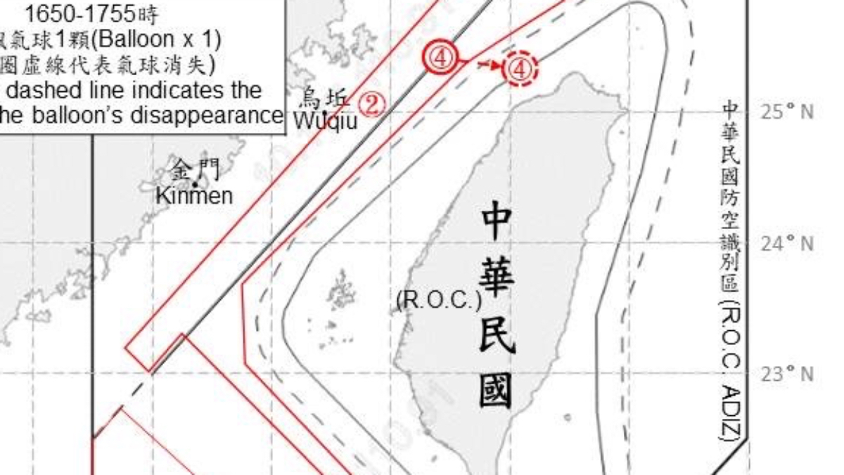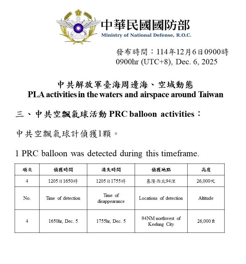 國防部2025.12.06發布在12.05偵獲一枚中國空飄氣球,在穿越台海中線後消失。國防部