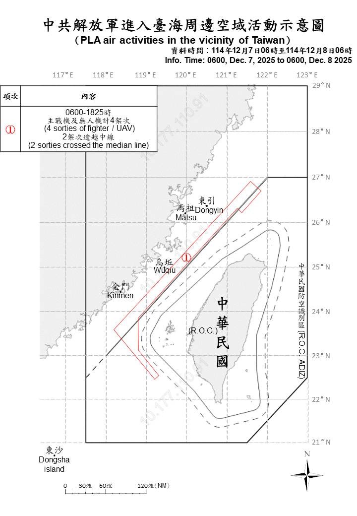 國防部2025.12.8上午公布中共解放軍在台海周邊海空域動態,從12.07上午6時起至12.8上午6時止,共偵獲共機4架次(逾越台海中線進入北部及西南空域2架次)及共艦7艘。國防部