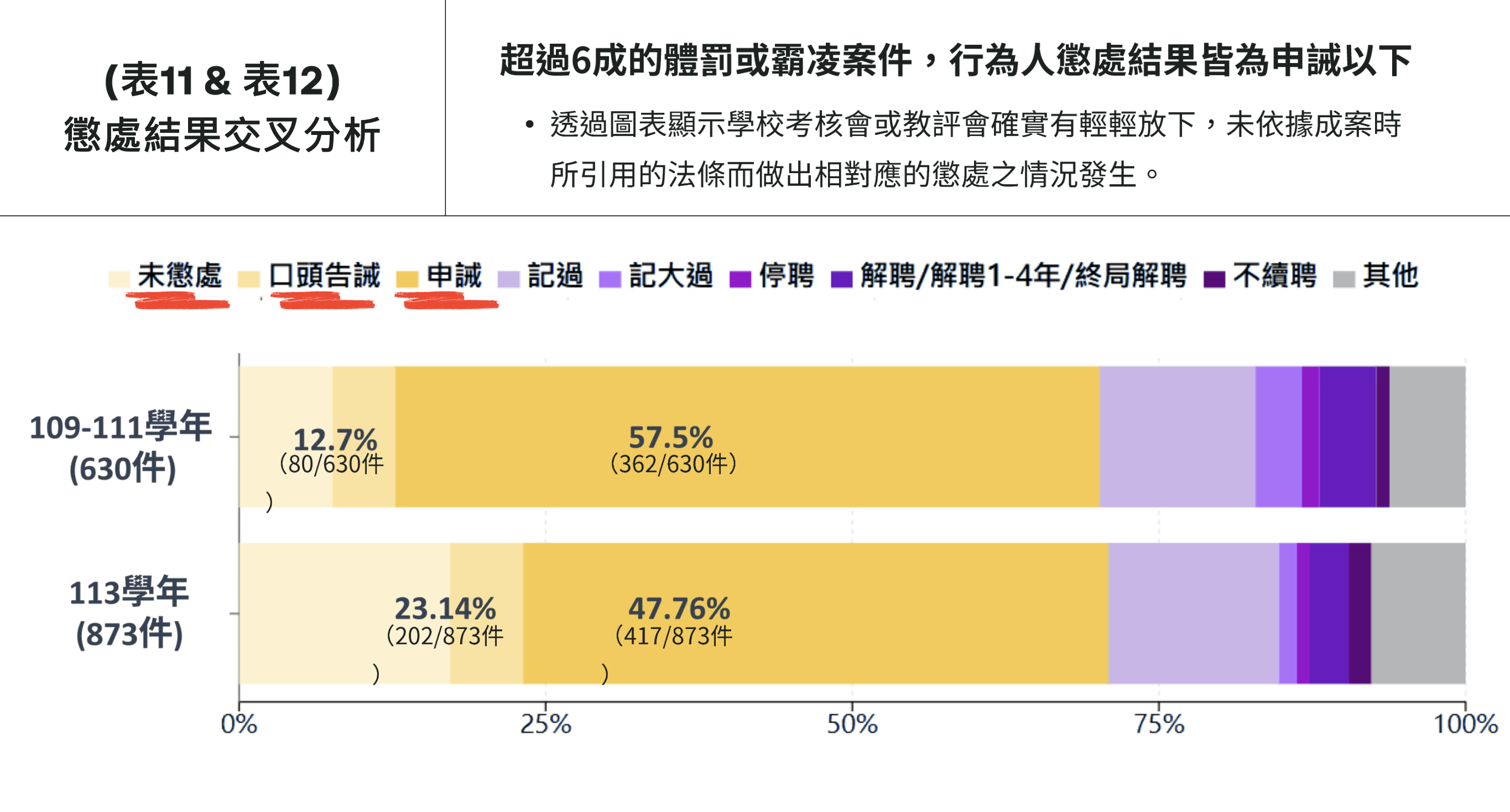 調查報告並顯示,106-111學年度調查成案案件裡,有近7成懲處結果為申誡以下或未懲處,109-111學年度超過6成體罰或霸凌懲處結果皆為申誡以下;113年解聘辦法重修後,調查懲處結果遭輕縱的比例與109-111學年度比例相當,皆占7成。