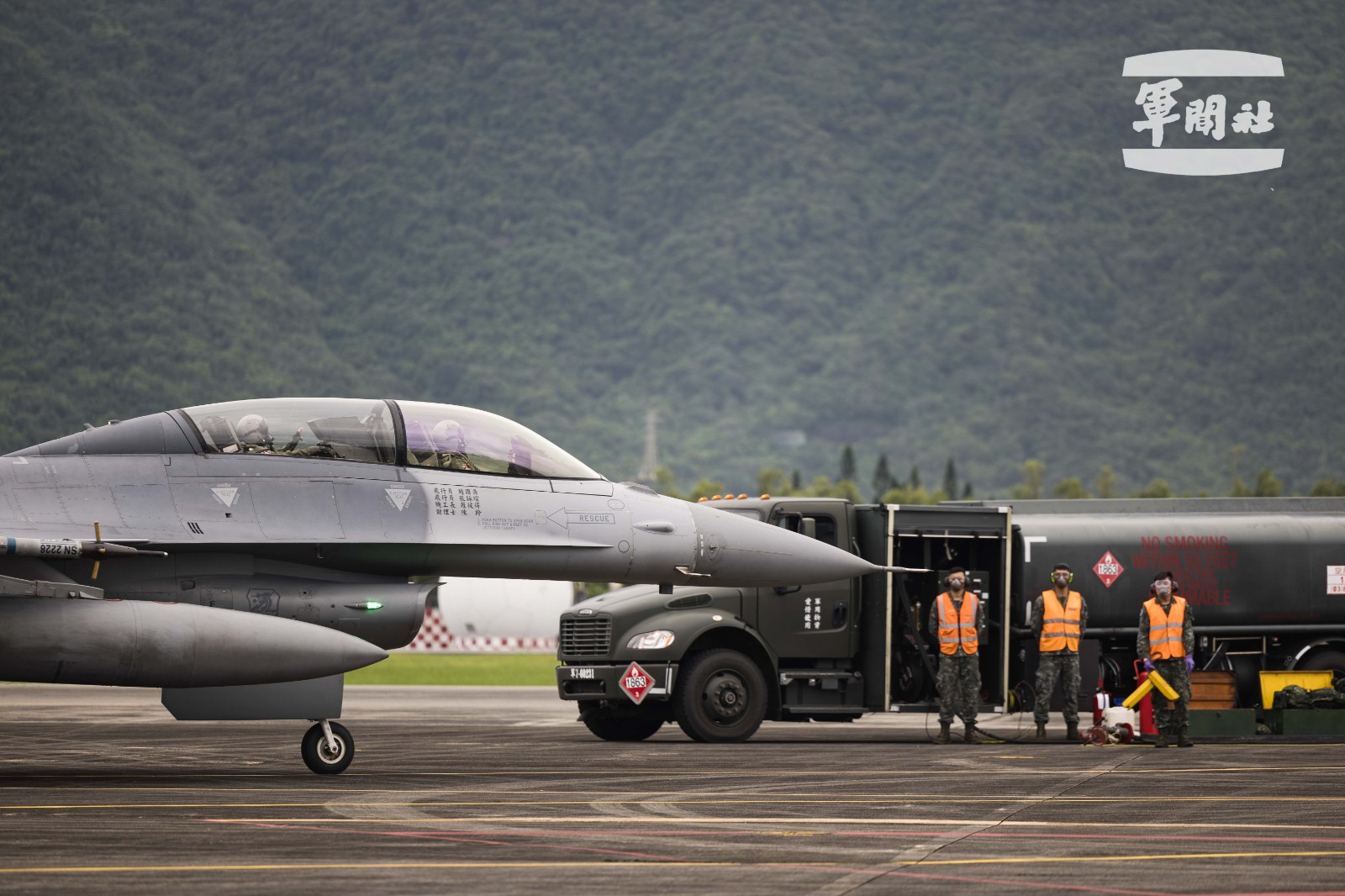 F-16戰機滑行,準備執行熱加油作業。(軍聞社記者李恬恬攝)