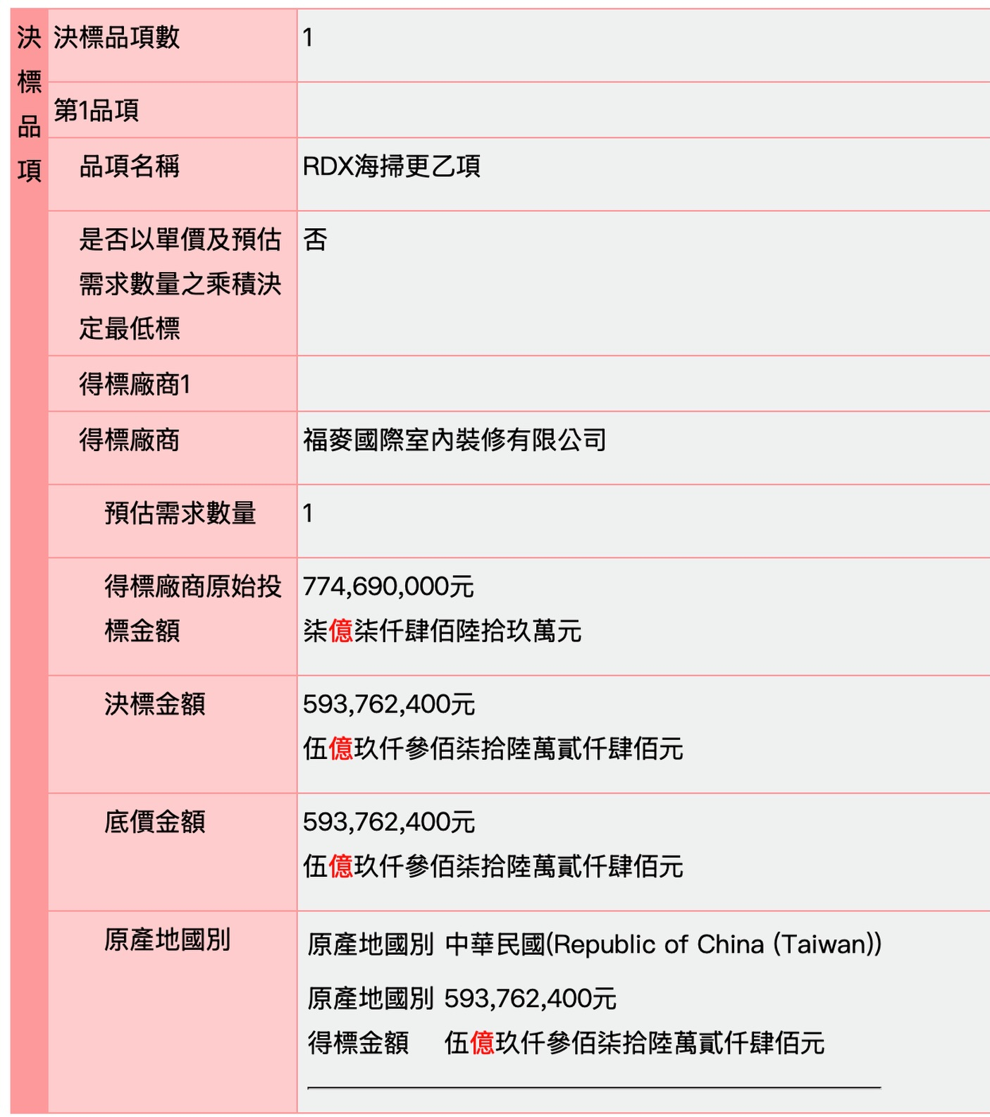 人民的納稅錢是否用在刀口上?國民黨立委王鴻薇今天(12/10)發文表示,國防部標案編號(JE15005L097)RDX海掃更公開招標採購之決標公告,決標金額5.9億,得標的是位在台南的一家登記室內裝修公司,王鴻薇質疑難道這是小吃店進口快篩劑翻版嗎?如此高價的國防部標案,室內裝修公司竟有能力承包,真令人嘖嘖稱奇。