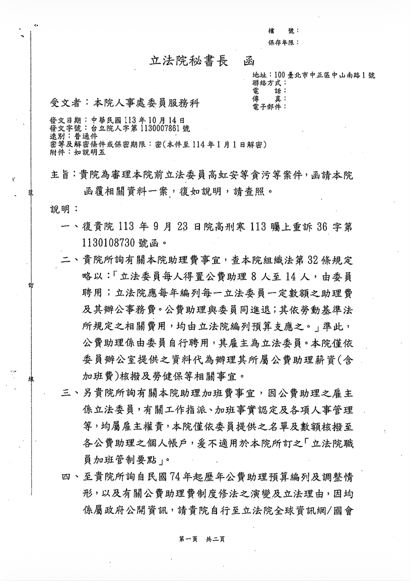 新竹市長高虹安助理費案在二審出現大逆轉,高院以立法院回函,指助理費和加班費本質上應屬於「實質補助,彈性勻用」性質,因此改判貪污無罪。民進黨立院黨團18日收到該份公文,但公文內容未見高院法官所認定之助理費性質為「實質補助,彈性勻用」以及補助立委問政所須財力不足等內容。對此,台灣人工智慧實驗室創辦人杜奕瑾表示,大家錯怪立法院法制局了,法官竟然引用不存在的文字,因人設事?支持檢察官上訴。