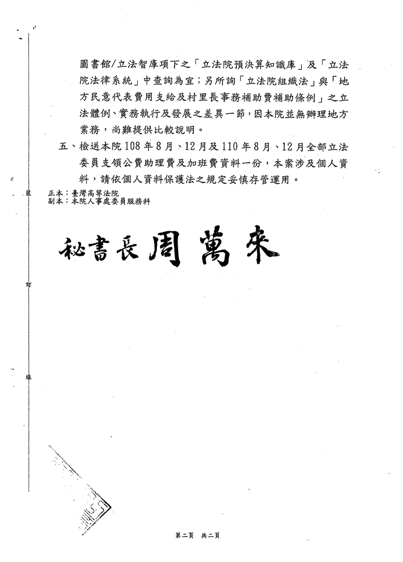 民進黨團收到立法院函覆高等法院的公文內容。翻攝畫面
