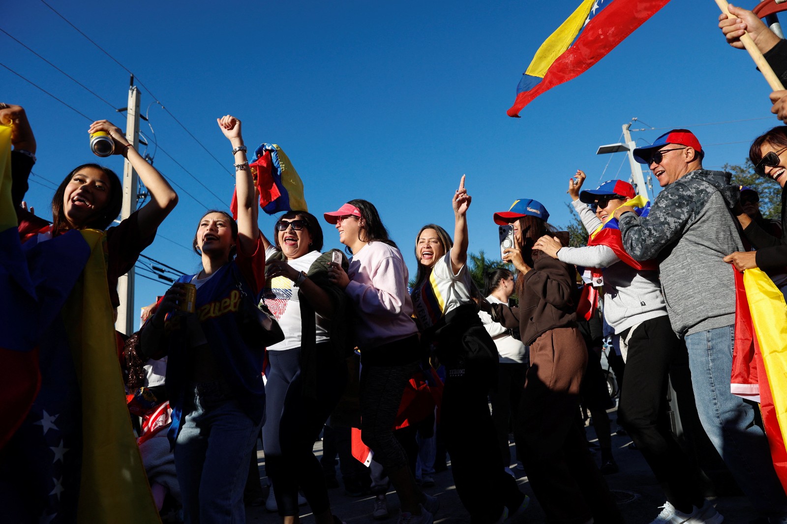 移居美國佛州邁阿密的委內瑞拉民眾,聽聞美軍擒獲委國總統馬杜洛的消息,上街慶祝揮舞祖國國旗。路透社