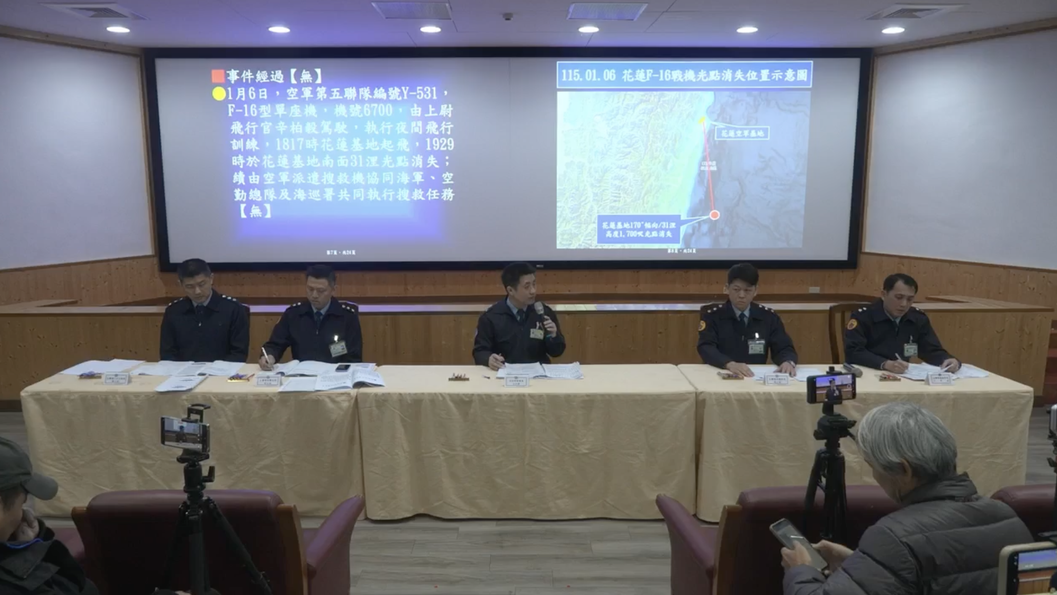 空軍司令部2026.1.7於花蓮空軍基地舉行記者會,由督察長江義誠少將(中)主持,說明第五聯隊編號6700的F-16V Block 20單座機失事最新情況。截自空軍司令部直播