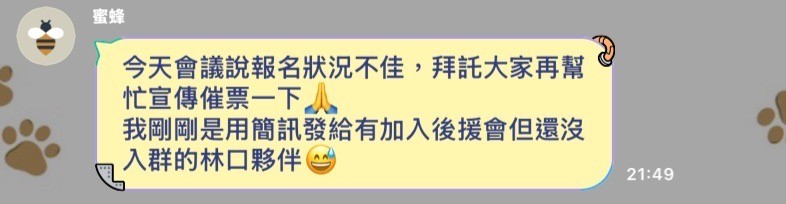 黃國昌「新北市後援會成立大會」報名情況慘淡,有支持者在LINE群組呼籲大家參加。讀者提供。