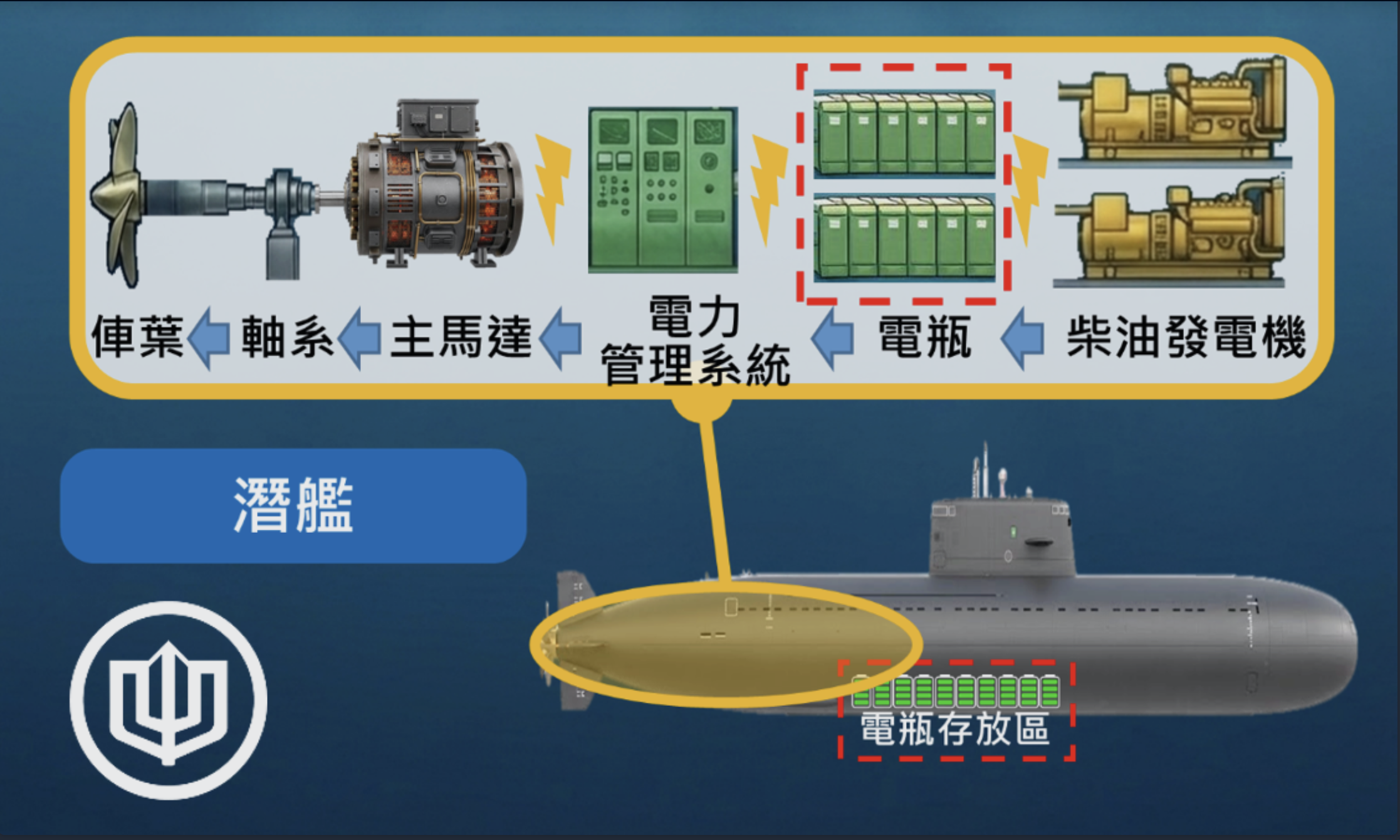 動力系統:水面船艦 VS 潛艦水面船艦航行靠主機;潛艦航行主要靠電瓶,主機主要是替電瓶充電。