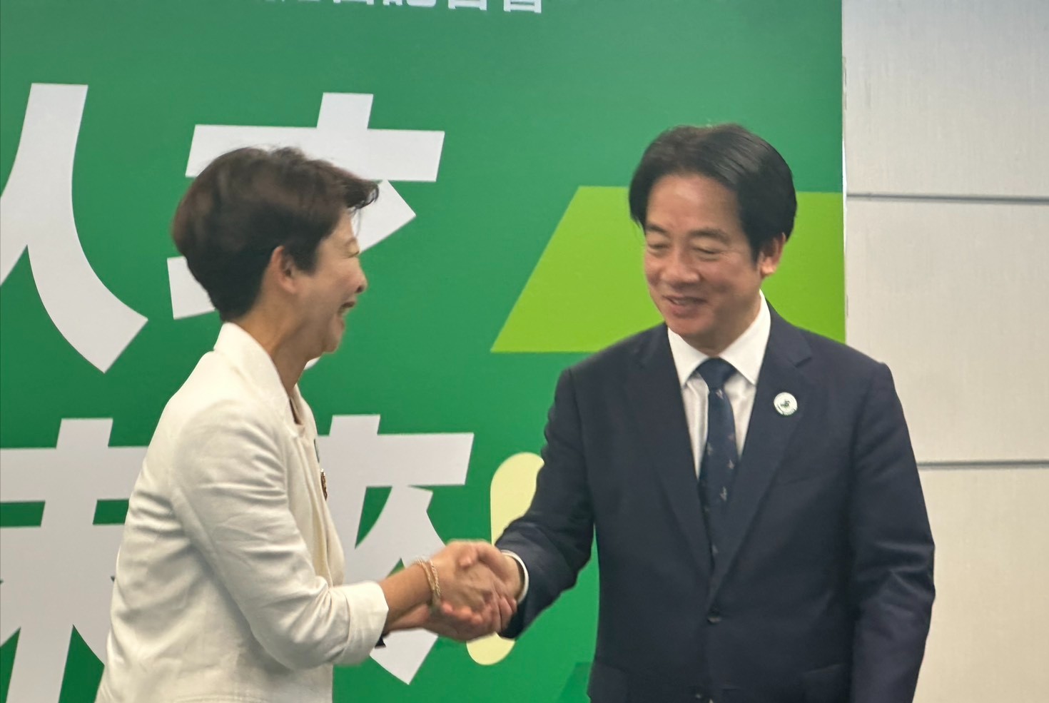 民進黨主席賴清德與台南市長候選人陳亭妃握手。楊亞璇攝
